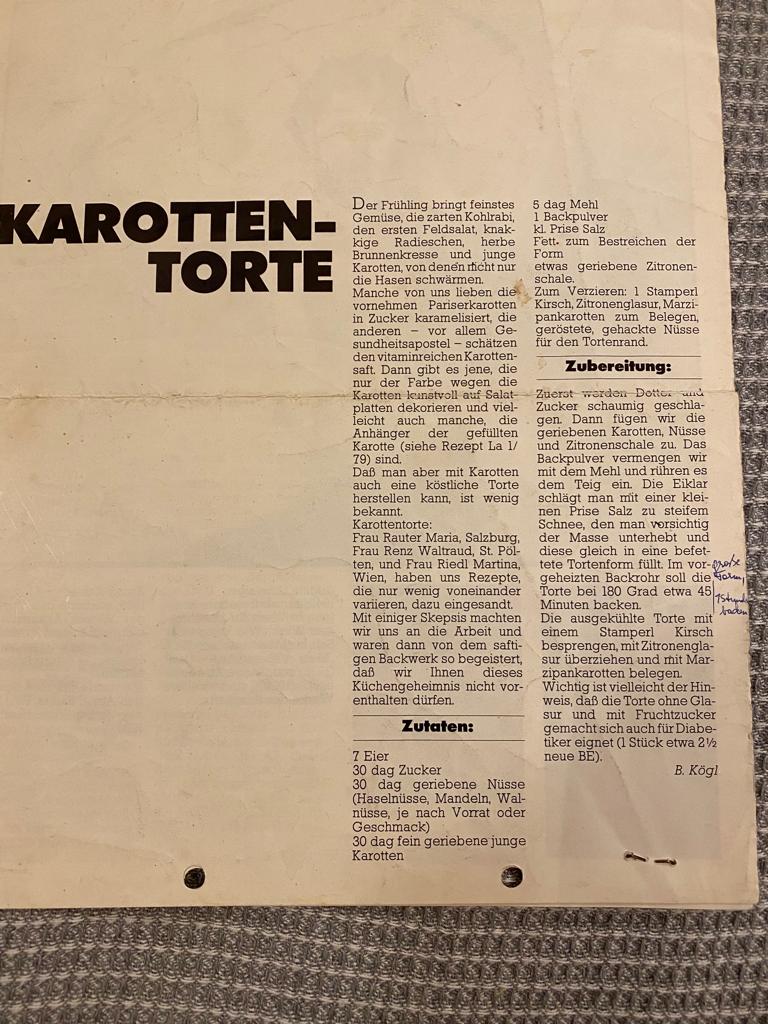 Zuerst werden Dotter und Zucker schaumig geschlagen. Dann fügen wir die geriebenen Karotten, Nüsse und Zitronenschale zu. Das Backpulver vermengen wir mit dem Mehl und rühren es dem Teig ein.